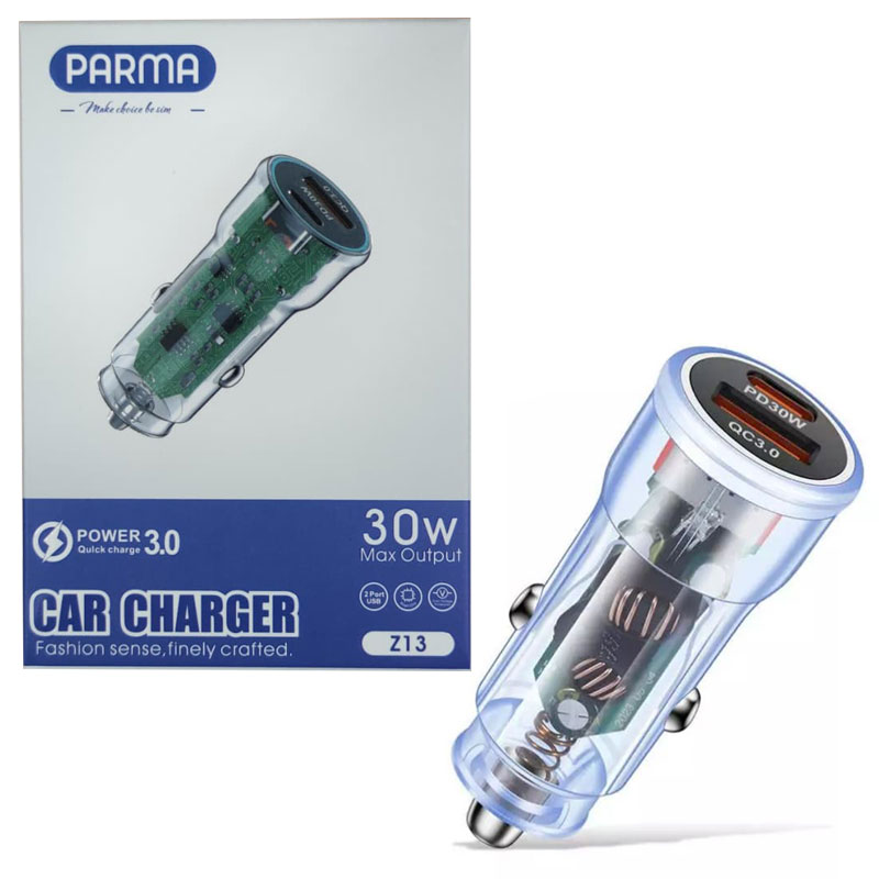 شارژر فندکی Parma Z13 با توان خروجی 30 وات، یک شارژر فندکی با دو پورت است که یکی از پورت های آن از فناوری PD فست شارژ (Power Delivery) پشتیبانی میکند. این محصول مناسب شارژ سریع و همزمان دو دستگاه مختلف در خودرو است.این شارژر گزینه ای اقتصادی و کاربردی برای کسانی است که به دنبال یک شارژر فندکی کارا با قابلیت شارژ سریع هستند و می خواهند در حین رانندگی، دستگاه های خود را ایمن و سریع شارژ کنند