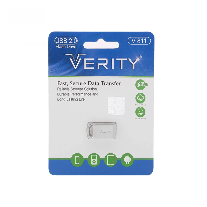 فلش وریتی VERITY V811 32GB یک فلش مموری با کیفیت مناسب از شرکت وریتی است. این فلش مموری با ظرفیت ۳۲ خود قابلیت ذخیره سازی بیشتر از ۲۰۰۰ آهنگ با کیفیت را دارد، همچنین اگر جزو آن دسته از افراد هستید که عاشق تماشای فیلم ها و سریال های روز دنیا هستید، می توانید چیزی بیش از ۱۵ فیلم را با کیفیت مناسب درون این فلش مموری جای دهید. به علاوه با پیشرفت تکنولوژی و به بازار آمدن فلش مموری های با ظرفیت بالاتر دیگر فلش های ۸ گیگ و پایین تر صرفه اقتصادی ندارند و اختلاف قیمت بسیار کمی با نوع ۳۲ گیگی خود دارند، به همین دلیل تهیه یک فلش مموری ۳۲ گیگی مانند فلش وریتی VERITY V811 32GB یک گزینه اقتصادی و به صرفه به نظر می رسد. فلش وریتی VERITY V811 32GB با بدنه فلزی خود در برابر بسیاری از ضربه ها مقاوم است، به همین دلیل می تواند یک همراه خود در فضاهای باز و آزاد برای شما باشد. همچنین این فلش مموری دارای یک سری USB 2.0 است که اطلاعات را باسرعت مناسبی انتقال می دهد.